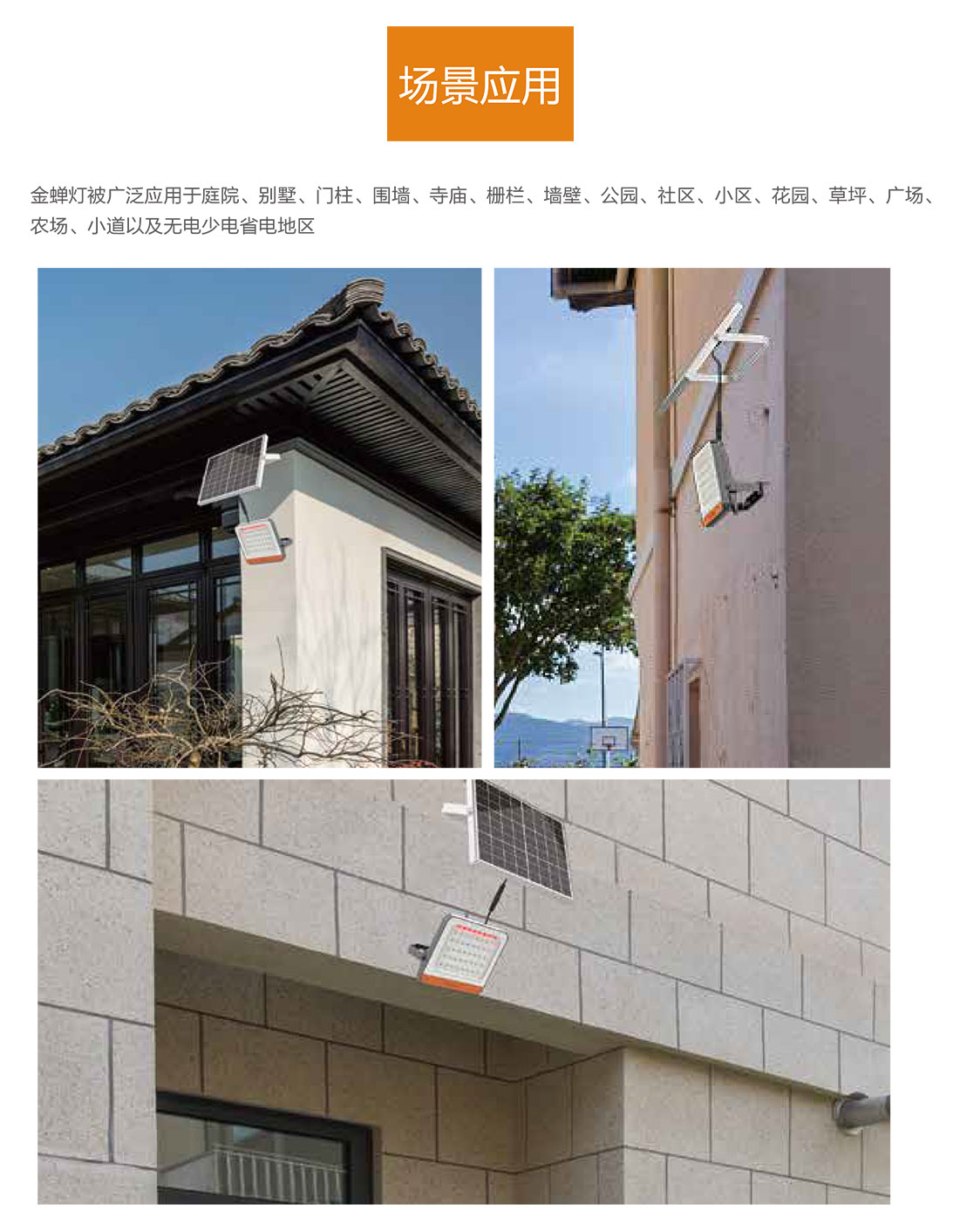 金蟬燈作為太陽能投光燈,被廣泛應用于庭院、廣場、私家花園、別墅、寺廟、農場、戶外廣告牌等場景。